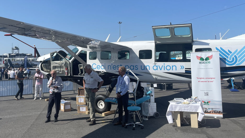 Présentation du projet sur le stand d’Aviation Sans Frontières au Salon du Bourget, en présence de Gérard Feldzer, président d’Aviation Sans Frontières, Jean-Jacques Dumesnil, président fondateur de Médicaéro, de Benoît Laurent, responsable des opérations aériennes Aviation Sans Frontières et Thomas Pesquet, parrain d’Aviation sans Frontières. (juin 2025)