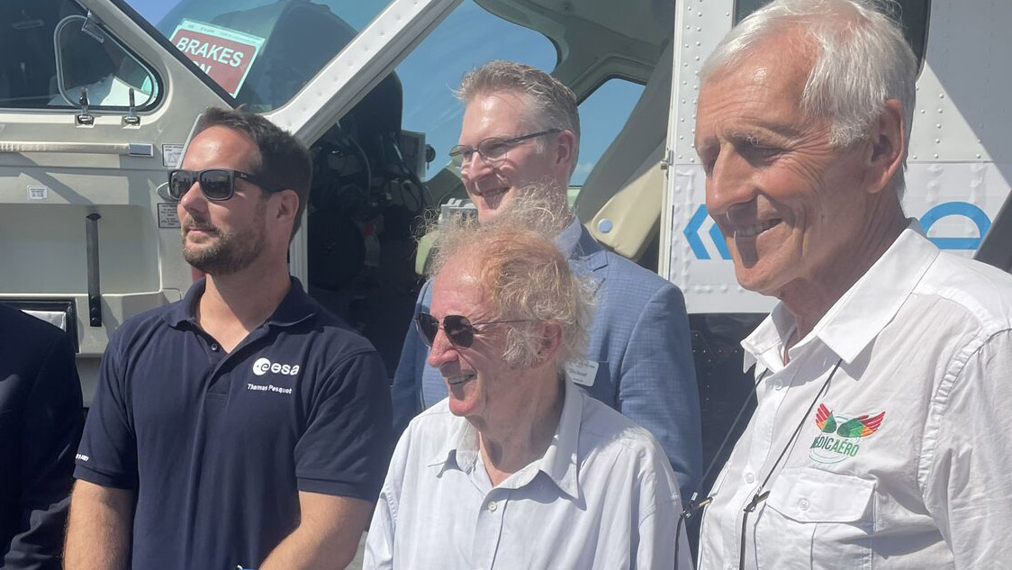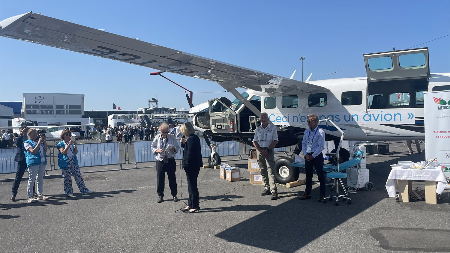 Présentation du projet sur le stand d’Aviation Sans Frontières au Salon du Bourget, en présence de Gérard Feldzer, président d’Aviation Sans Frontières, Jean-Jacques Dumesnil, président fondateur de Médicaéro, de Benoît Laurent, responsable des opérations aériennes Aviation Sans Frontières et Thomas Pesquet, parrain d’Aviation sans Frontières. (juin 2025)